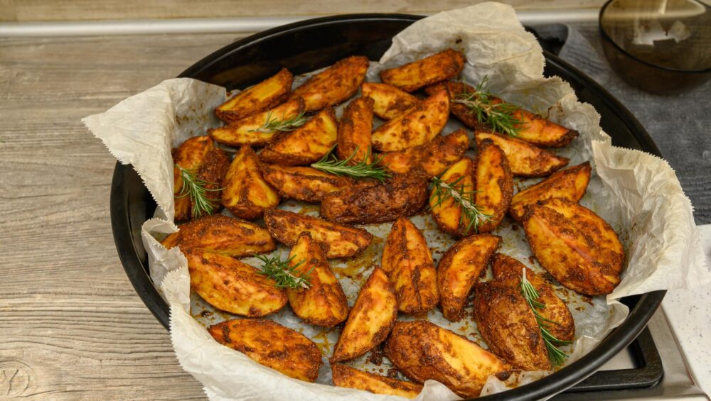 Cartofii wedges sunt una dintre cele mai populare garnituri. Rumeniți la cuptor și serviți cu sosul preparat din condimentul Sos pentru Cartofi, devin o gustare irezistibilă.