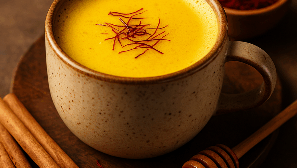 Un elixir relaxant, cunoscut ca „Golden Milk cu șofran” în India.