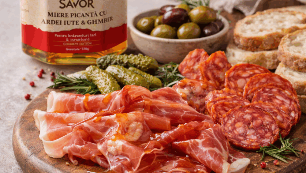 Mezelurile artizanale au nevoie de un contrapunct care să le pună în valoare. Mierea picantă cu ardei iute și ghimbir adaugă exact acel contrast: dulce, cald și ușor iute, care taie grăsimea și intensifică aromele naturale ale cărnii maturate.