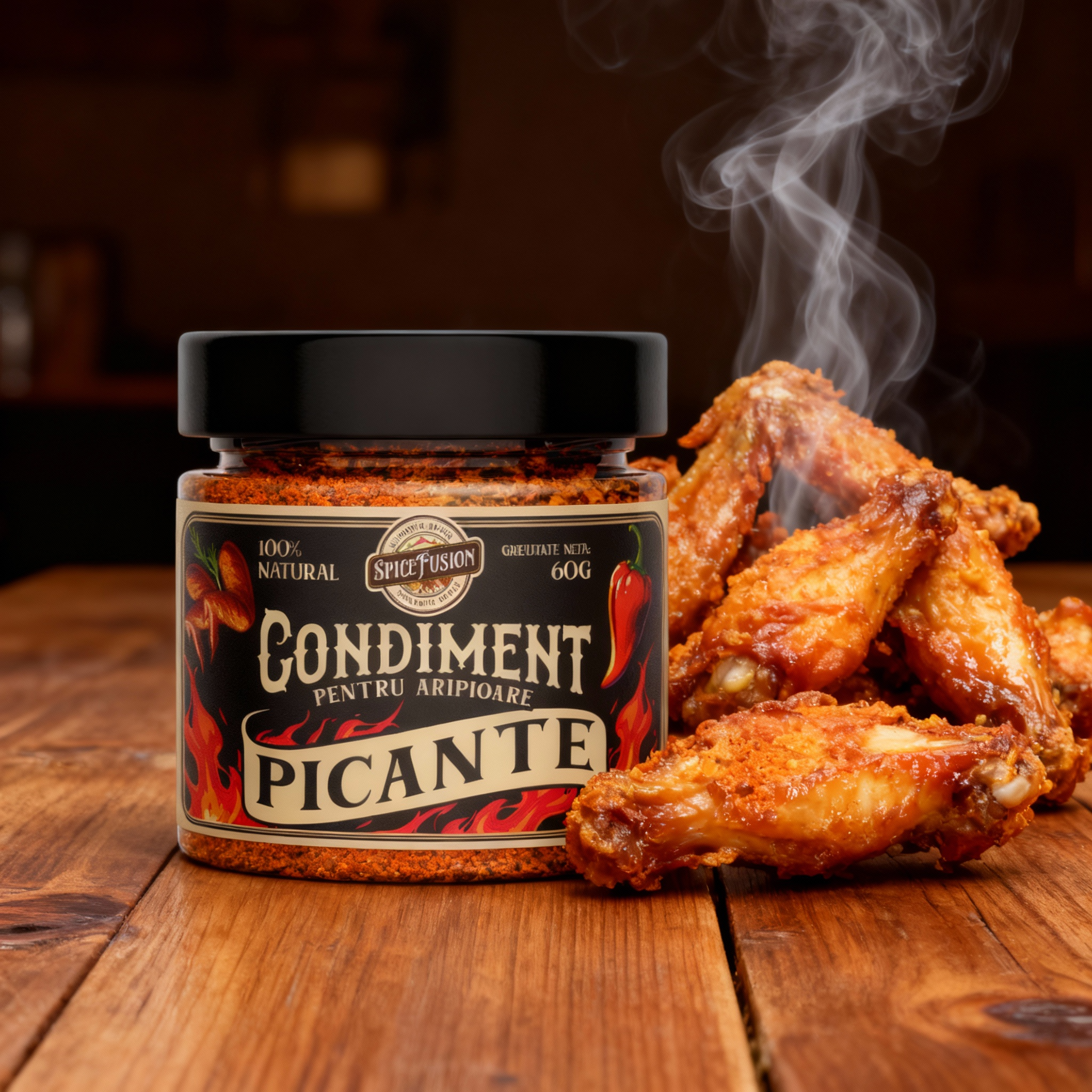 Aripioare rumenite și lipicioase, marinate cu Condiment pentru Aripioare Picante, ulei și miere, coapte la cuptor până devin crocante și pline de savoare. Perfecte pentru seri cu prietenii sau mese rapide cu un twist picant.