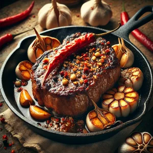 Steak de Vită la Tigaie cu Usturoi și Fulgii de Ardei Iute