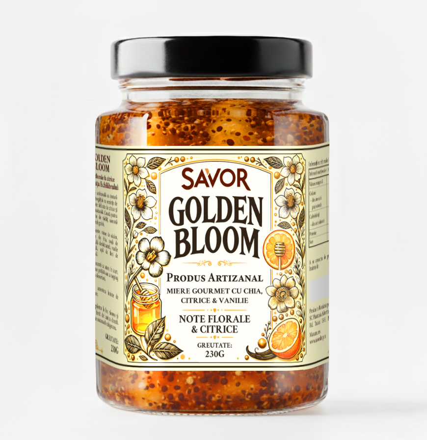 - Golden Bloom – Miere gourmet cu chia, citrice & vanilie